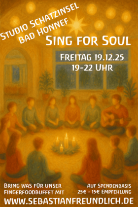 Sing for Soul – ein adventlicher Singkreis in Bad Honnef Wir laden dich herzlich ein zu einem Abend voller Klang, Wärme und Gemeinschaft.Wie auch im letzten Jahr, erschaffen wir Im Studio Schatzinsel miteinander einen Kreis, in dem unsere Stimmen zu einem großen, freudvollen, lebendigen Strom zusammenfließen. Ob geübt oder ungeübt – egal, denn beim gemeinsamen Singen geht …