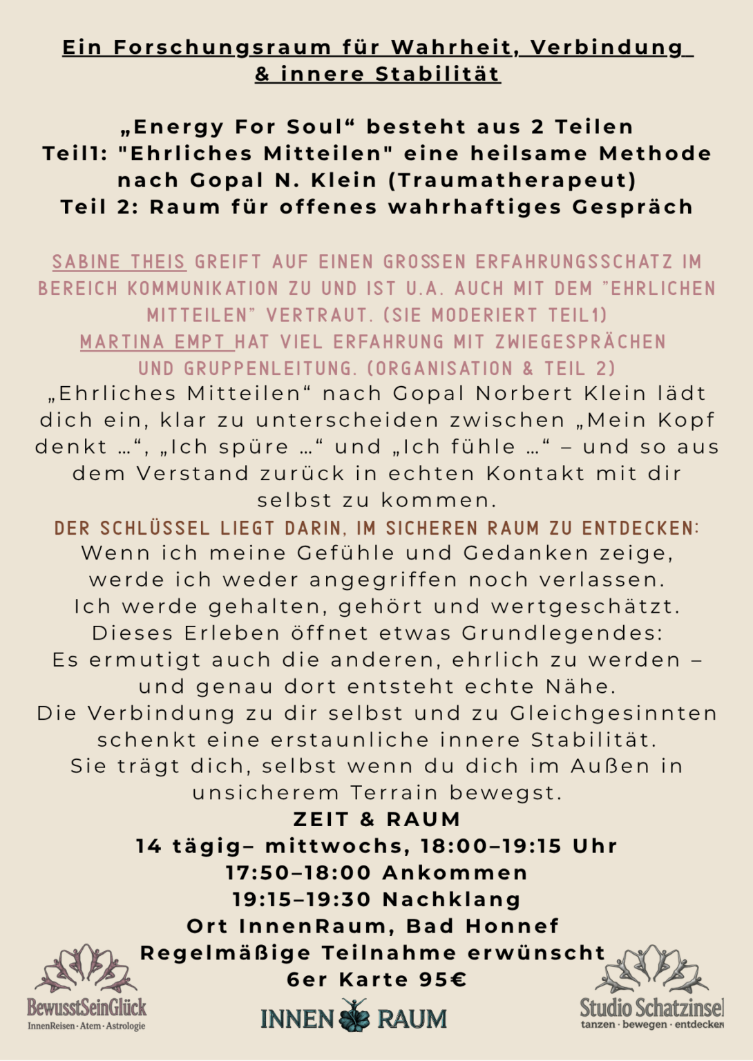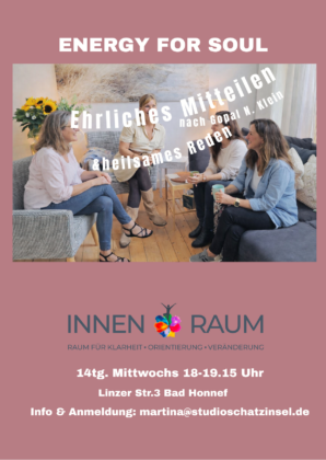 Ehrliches Mitteilen nach Gopal N. Klein..Gesprächskreis, News / Von soleil ENERGY FOR SOUL – unsere Gesprächsgruppe Mittwochs 18-19.15 hat ein neueres Format erhalten. Teil 1 : Ehrliches Mitteilen nach Gopal , Moderation Sabine TheisTeil 2 Wahrhaftiges Mitteilen im geschütztem Raum, Moderation Martina EmptFragen& Anmeldung bei Martina info@studioschatzinsel.de