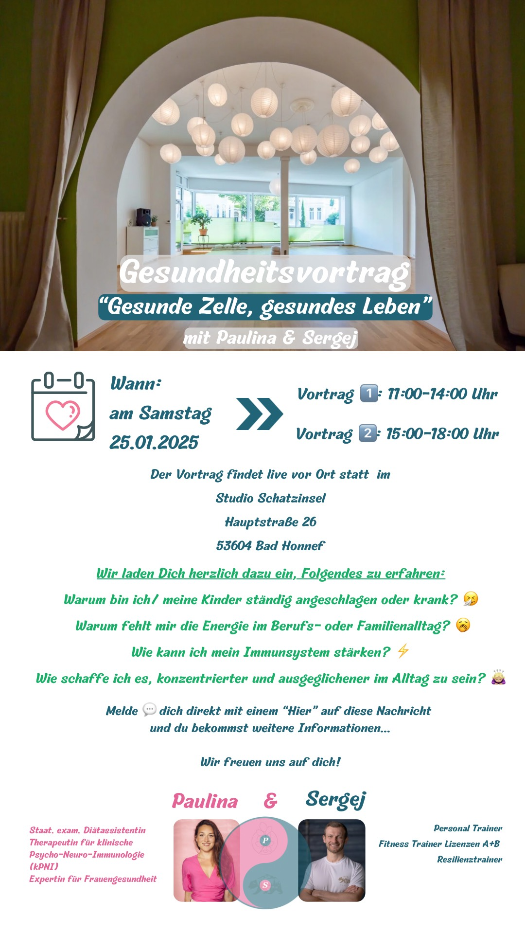 wir laden Dich herzlich zu einem informativen Vortrag ein, der sich mit der Bedeutung gesunder Zellen für ein vitales ⚡️ und erfülltes Leben beschäftigt. Aus der Praxis für die Praxis – du bekommst Einblicke, wie du dauerhaft gesund bleiben kannst.