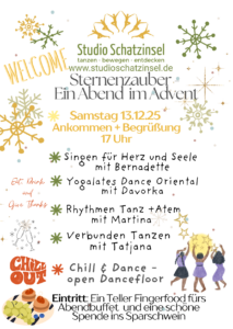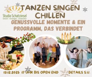 Das Abendbuffet wird sicherlich schon von Euren mitgebrachten Leckereien gefüllt und wir können uns wieder stärken und genießen und Tatjana zeigt uns ,wie wir miteinander in Verbindung tanzen.