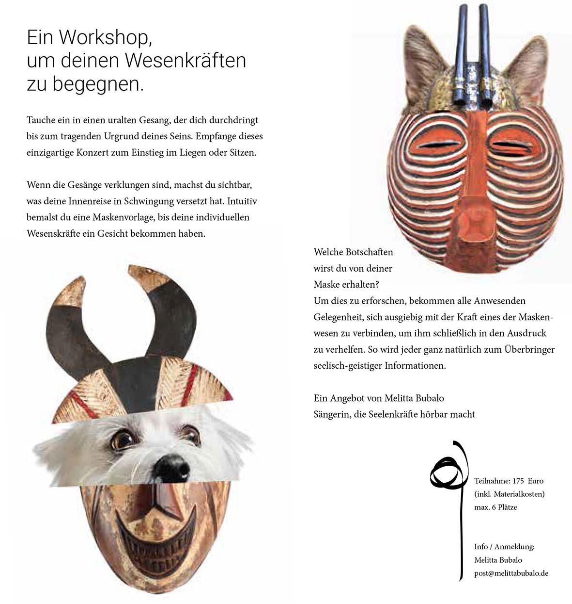 Um dies zu erforschen, bekommen alle Anwesenden Gelegenheit, sich ausgiebig mit der Kraft eines der Maskenwesen zu verbinden, um ihm schließlich in den Ausdruck zu verhelfen. So wird jeder ganz natürlich zum Überbringer seelisch-geistiger Informationen.